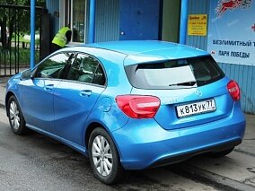 Несмотря на скромные габариты, А-класс способен удивлять. Это настоящий «Мерседес». Налет легкой буржуазности и безусловного стиля прослеживается в каждой детали кузова. Особое внимание привлекает огромная пасть решетки радиатора, на которой расположилась большая трехлучевая звезда – логотип марки. Корма, в свою очередь, удивляет фонарями с интересным рисунком светодиодных полосок и маленьким задним стеклом, что придает автомобилю агрессии. Молодые и активные люди наверняка оценят подобные дизайнерские решения по достоинству. Нужен автомобиль на прокат для поездки в фитнес-клуб или в офис? На любом фоне Mercedes А-класс будет смотреться гармонично и привлекательно.